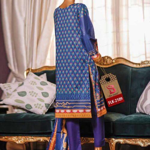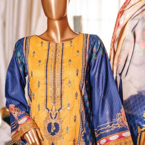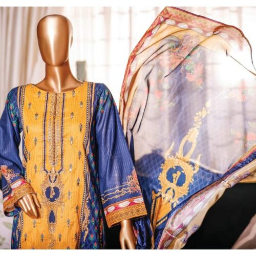BIN SAEED- 3PCS SUIT LAWN PRINTED & MIRROR EMBROIDERED W/ SILK DUPATTA (BLUE/YELLOW)